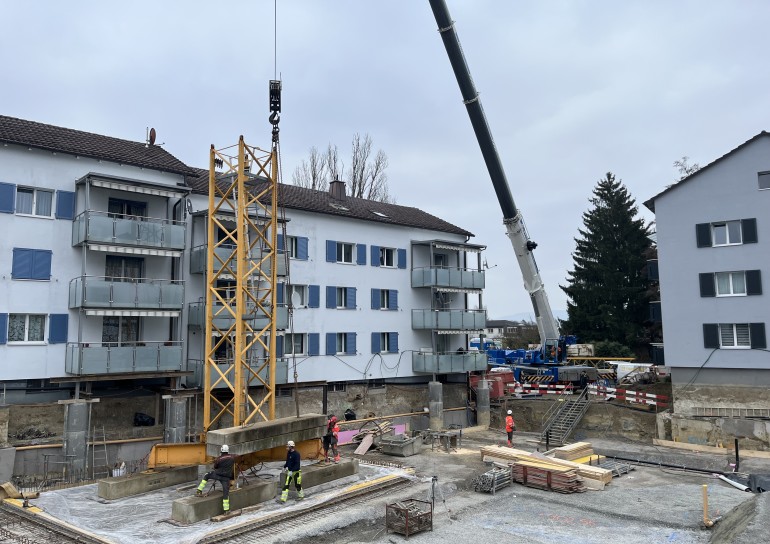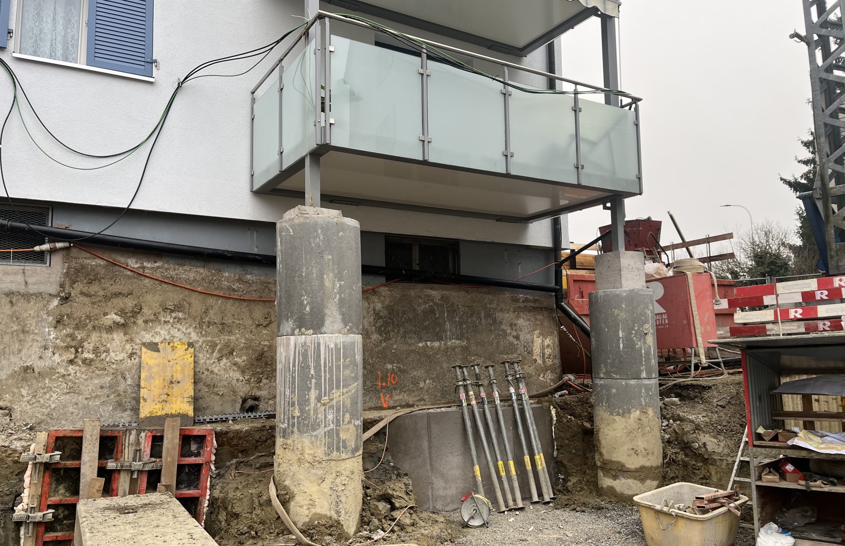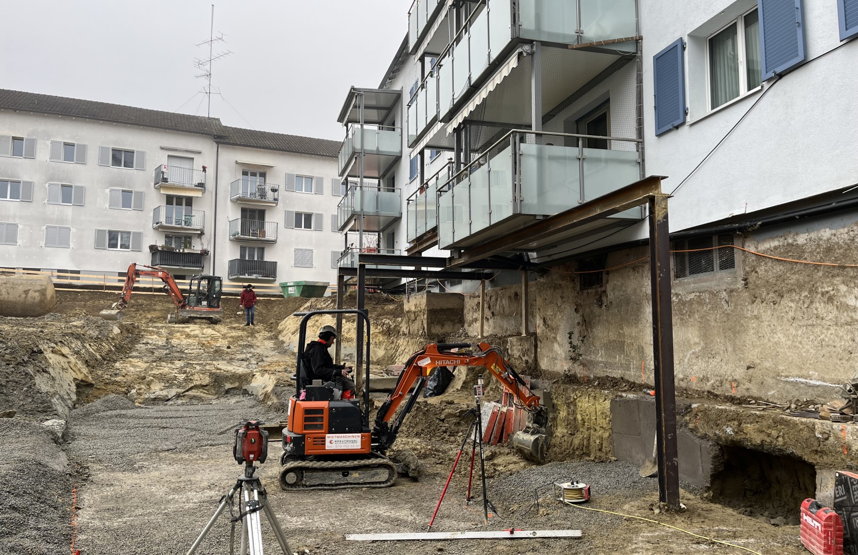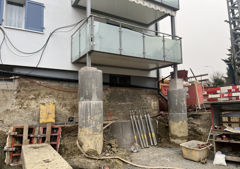 Aushubarbeiten MFH Stein am Rhein. Im Umfang der Aushubarbeiten mussten 2 bestehende MFH unterfangen, sowie deren Balkone abgefangen werden.
