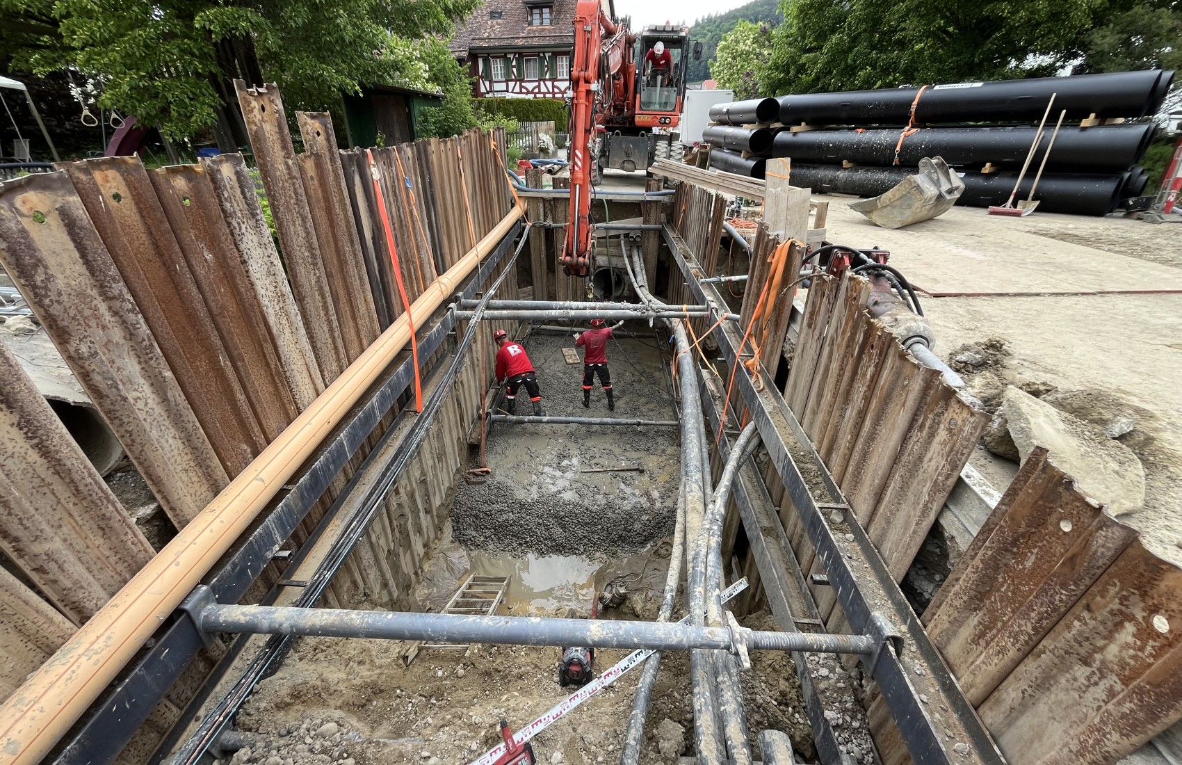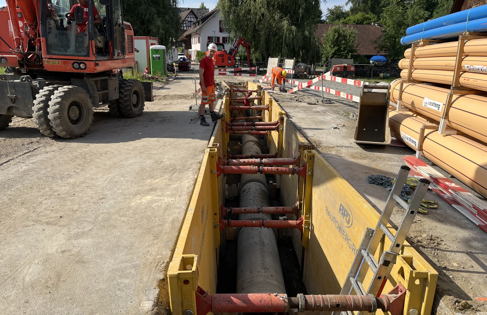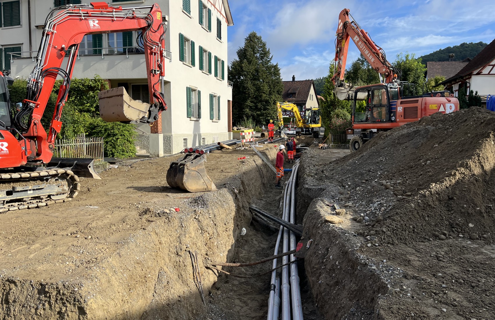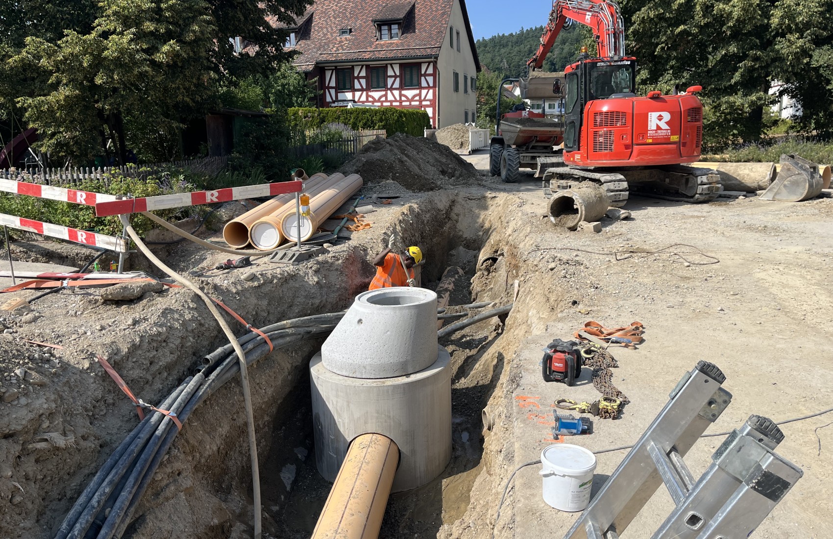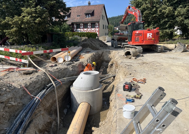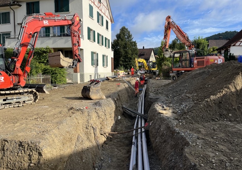Ausführung der Tiefbauarbeiten für die Sanierung der Werkleitungen.Sämtliche Werkleitungen wurden auf rund 250m durch das Dorf saniert:-Elektrisch-Swisscom-Wasser-Meteorwasser-Kanalisation mittels Relining