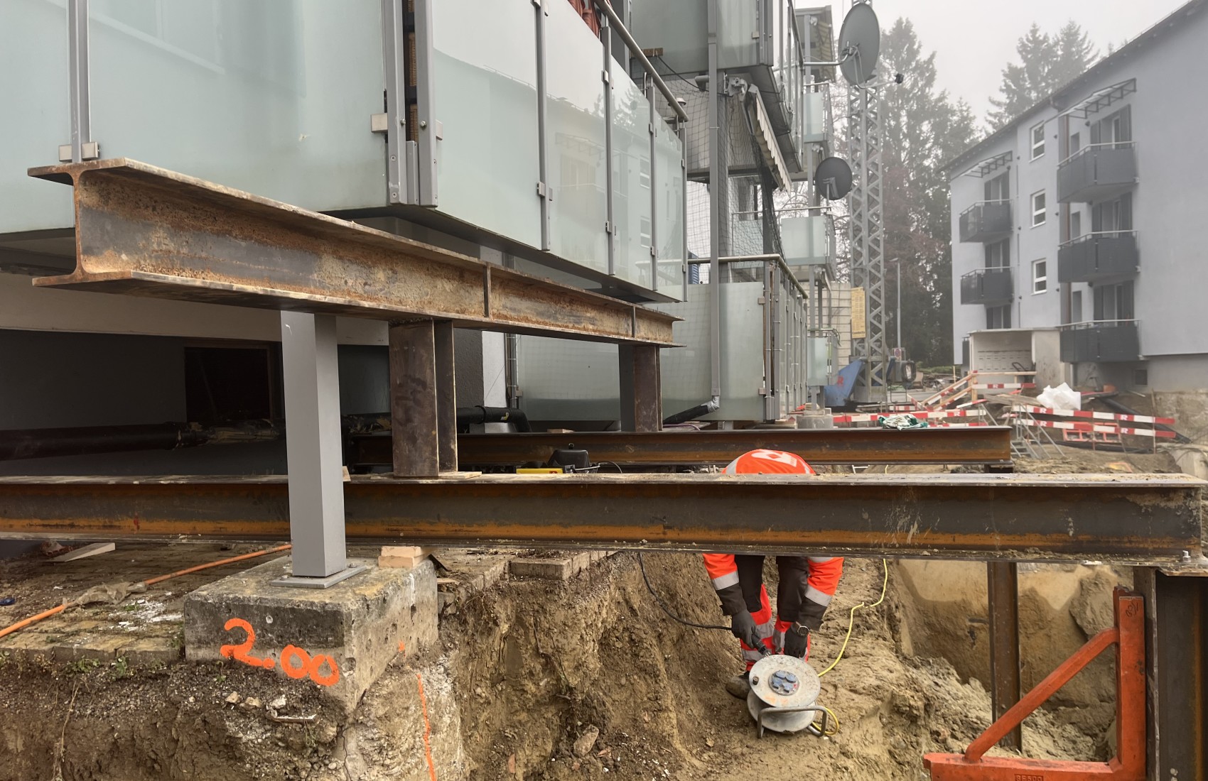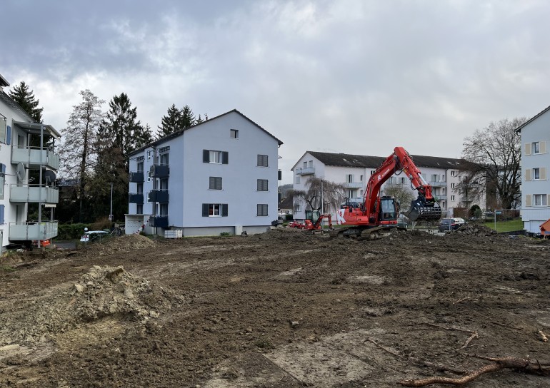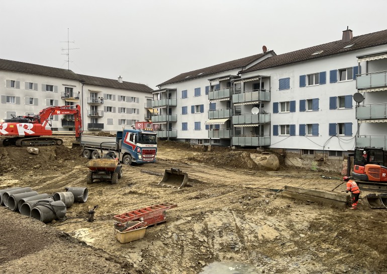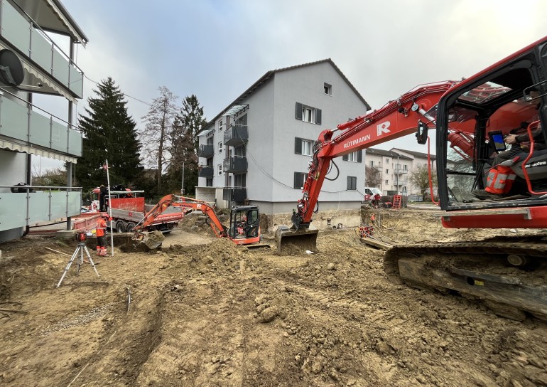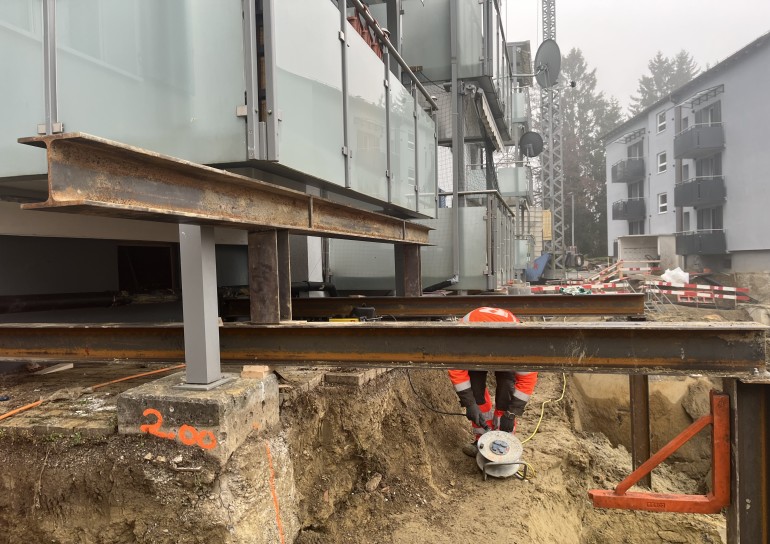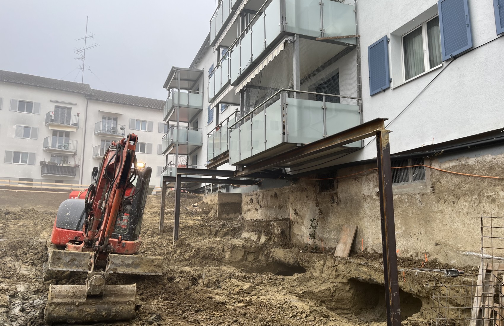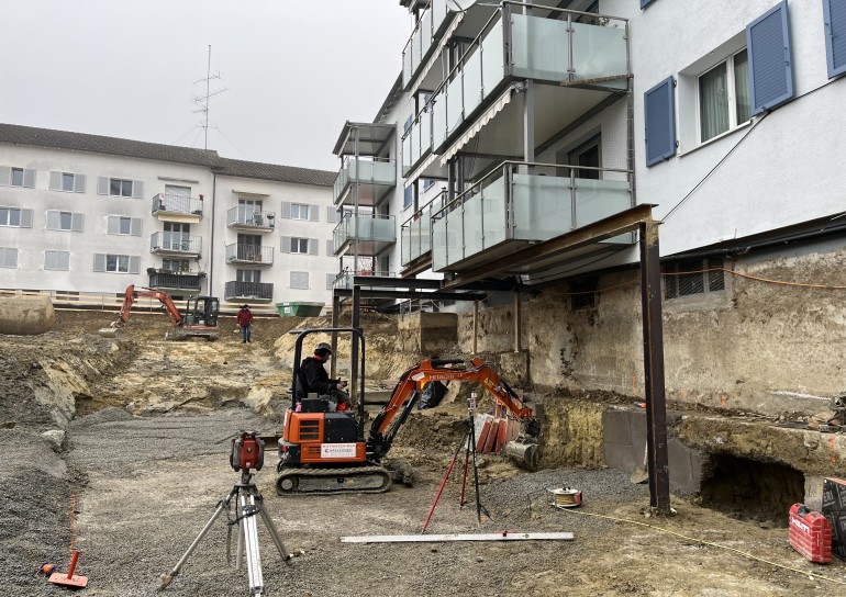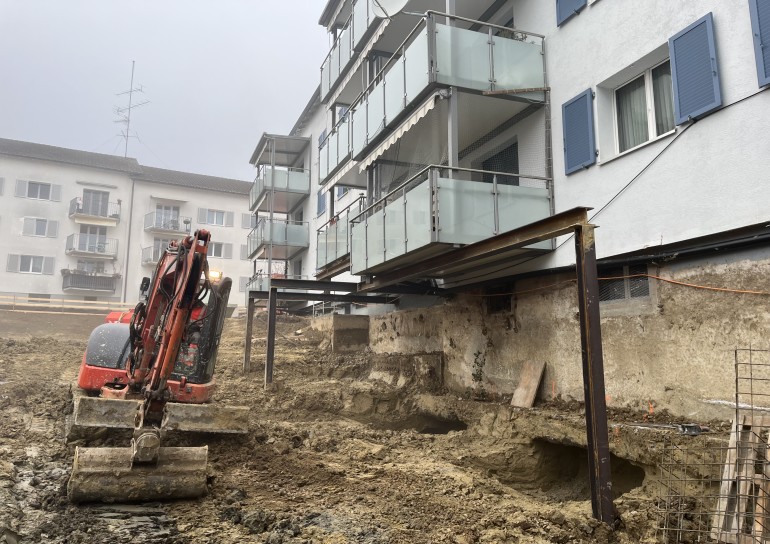 Aushubarbeiten MFH Stein am Rhein. Im Umfang der Aushubarbeiten mussten 2 bestehende MFH unterfangen, sowie deren Balkone abgefangen werden.