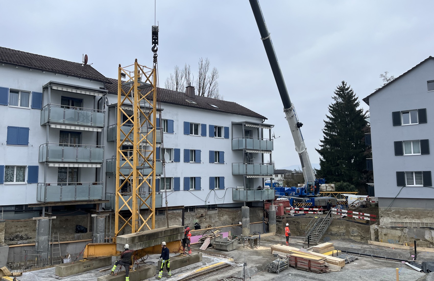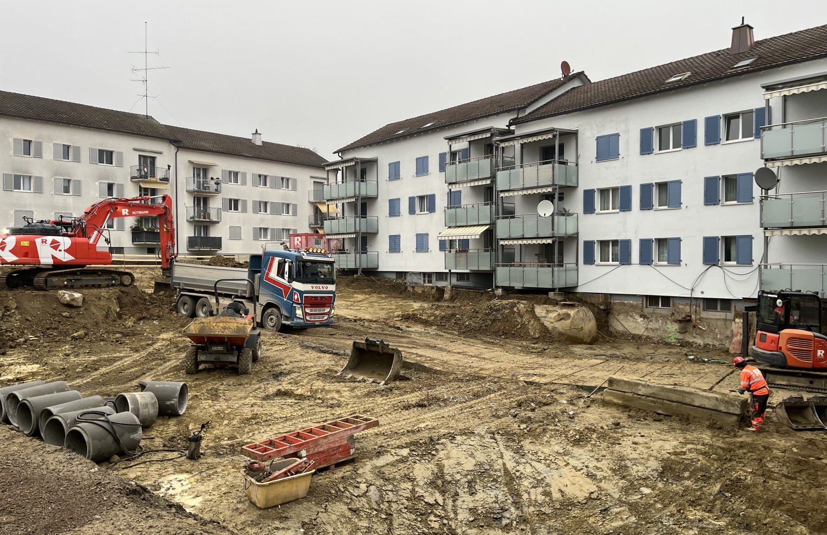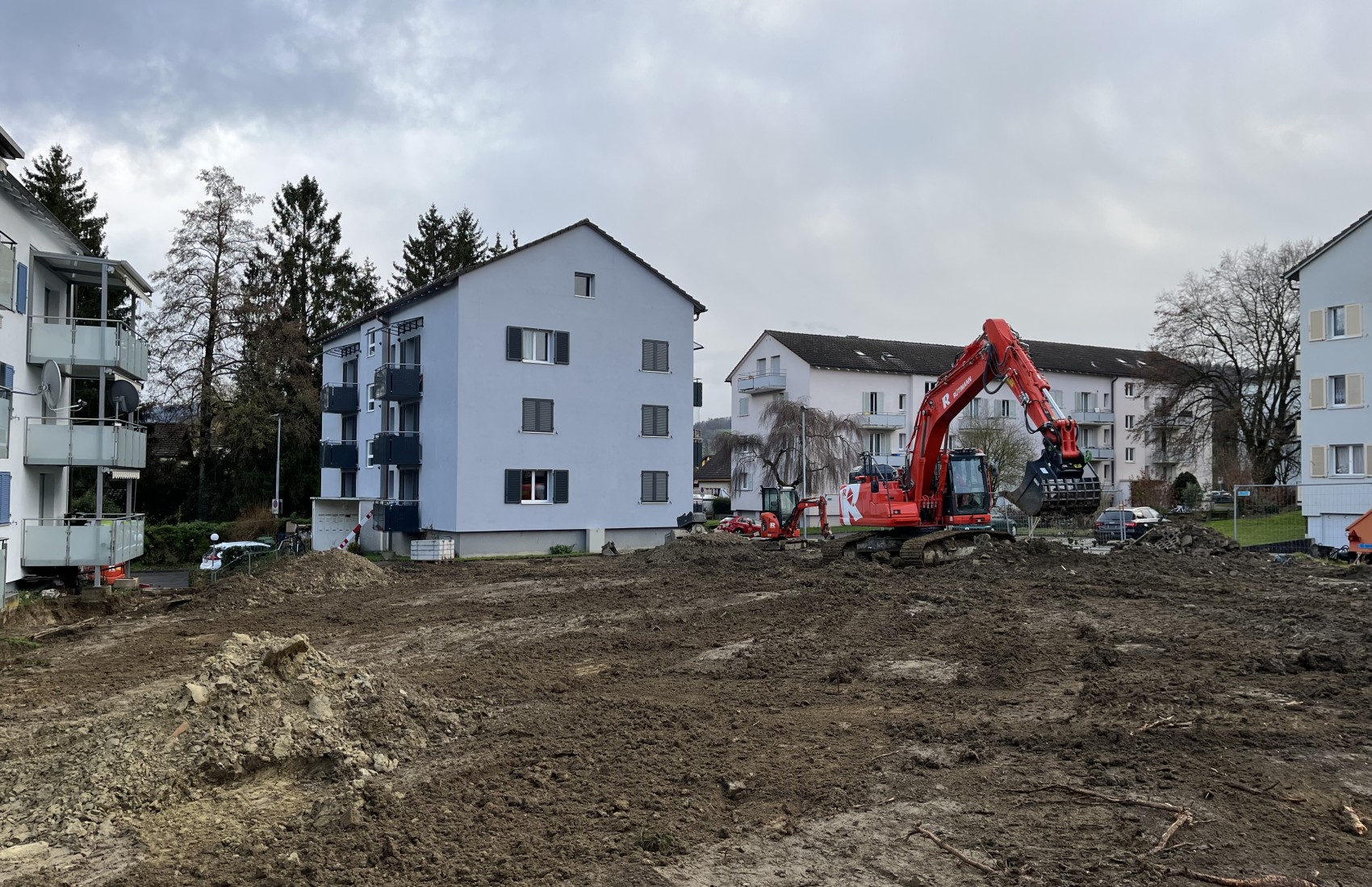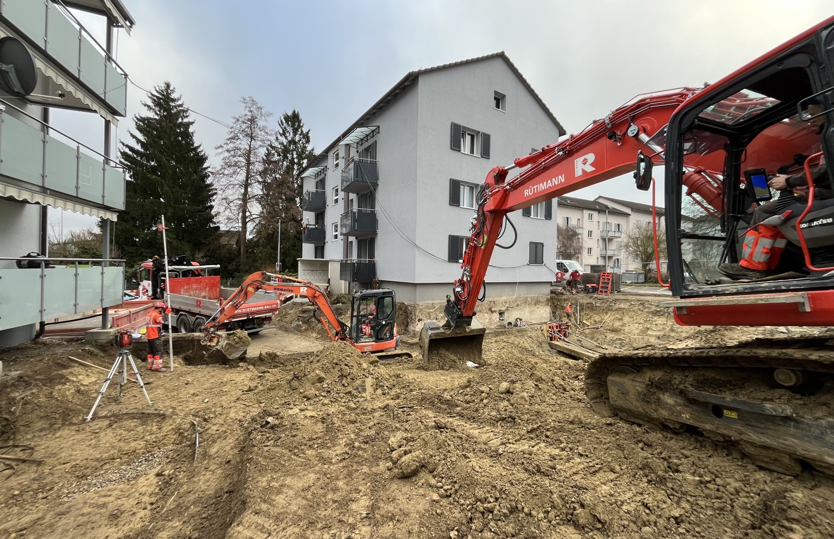 Aushubarbeiten MFH Stein am Rhein. Im Umfang der Aushubarbeiten mussten 2 bestehende MFH unterfangen, sowie deren Balkone abgefangen werden.