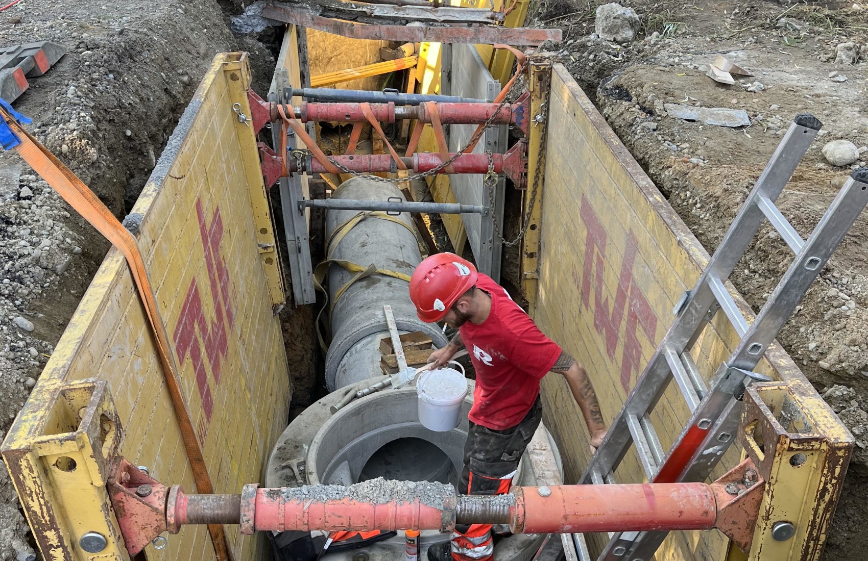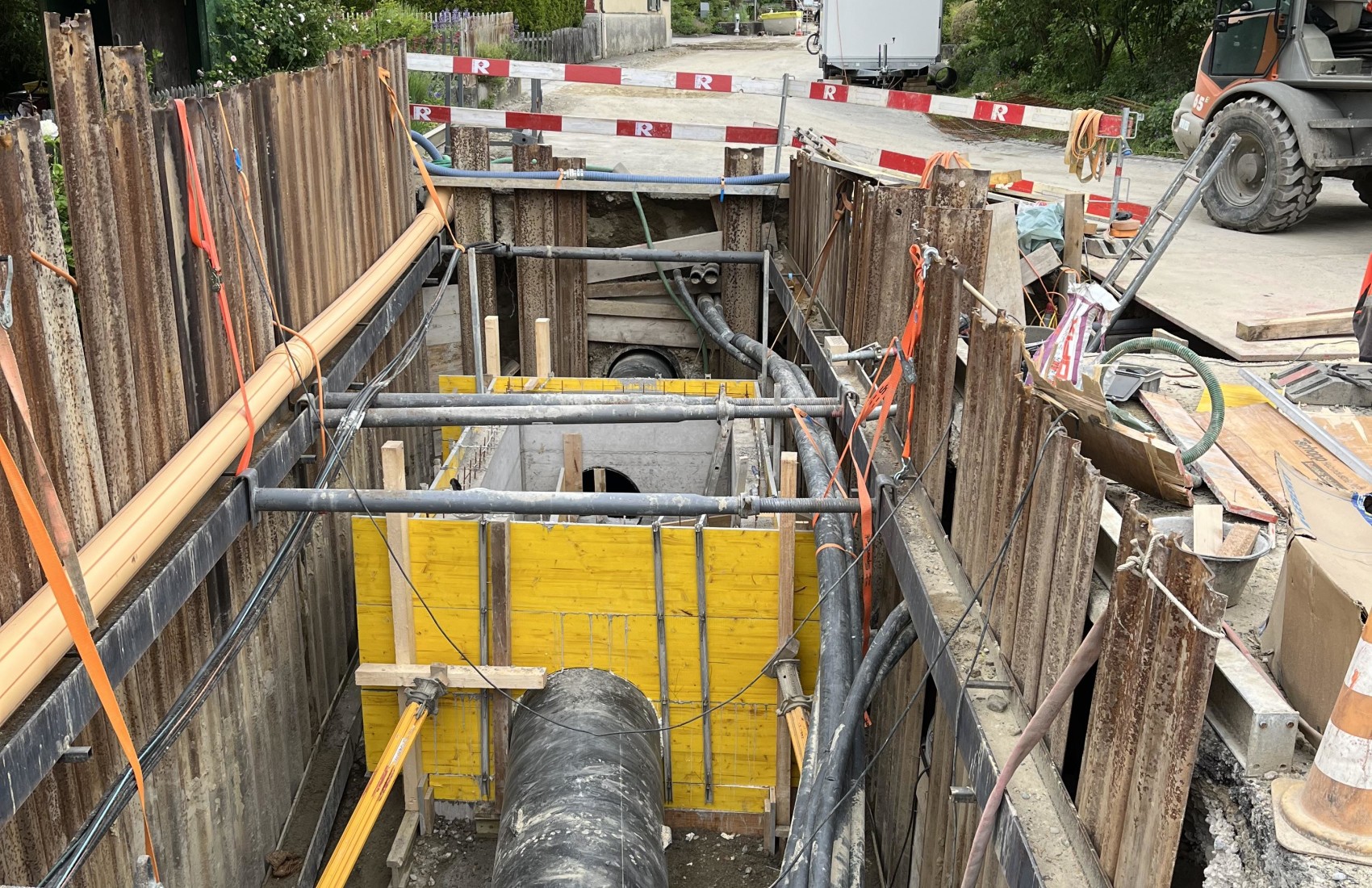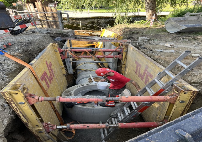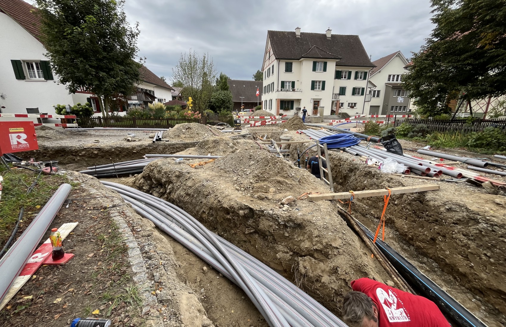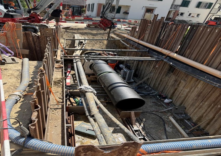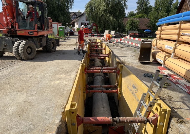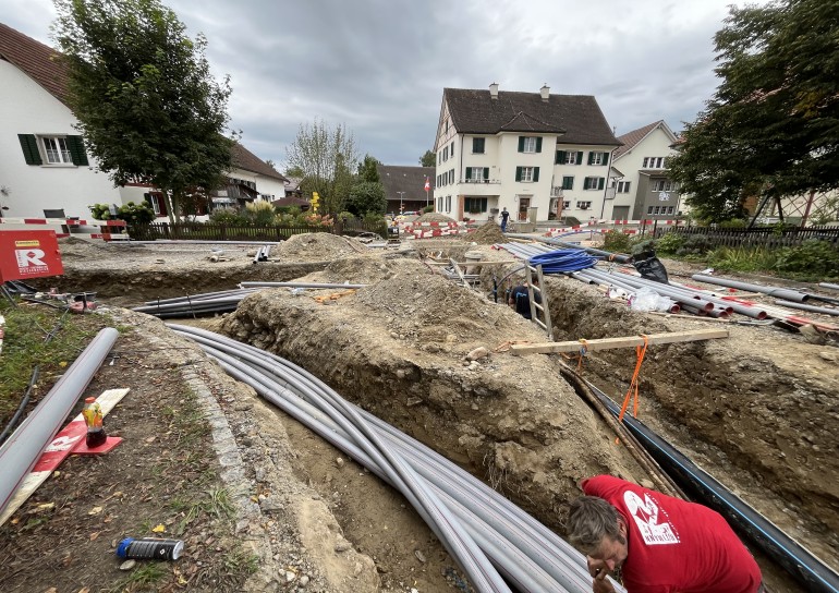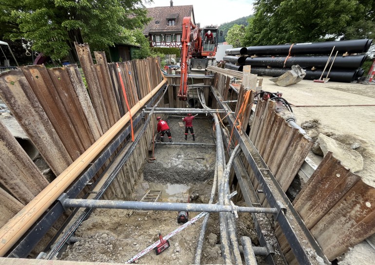 Ausführung der Tiefbauarbeiten für die Sanierung der Werkleitungen.Sämtliche Werkleitungen wurden auf rund 250m durch das Dorf saniert:-Elektrisch-Swisscom-Wasser-Meteorwasser-Kanalisation mittels Relining